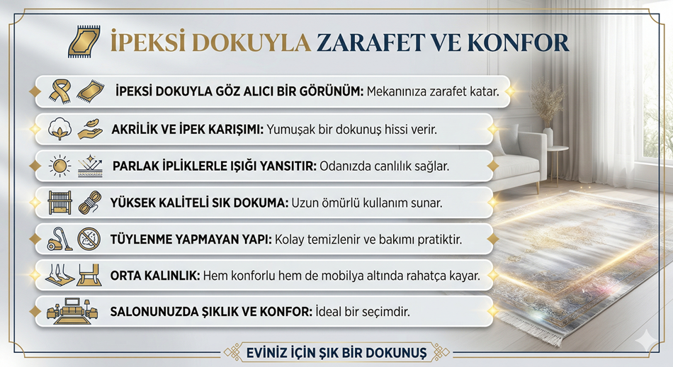 HANEDAN SIK DOKUMA İPEK AKRİLİK PARILTILI TÜY VERMEYEN YÜKSEK KALİTE SALON HALISI ORTA KALINLIKTADIR